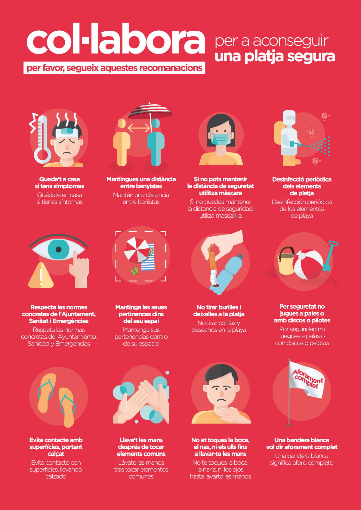 Las medidas establecidas en los planes de contingencia incluyen actuaciones respecto a la limpieza y desinfección de elementos comunes en las playas como pasarelas, juegos infantiles o lavapiés, establecimiento de entradas y salidas de uso preferente, incremento de la vigilancia tanto a través de medios humanos como tecnológicos con la incorporación de la vigilancia mediante drones, y acciones de información y concienciación a los usuarios y usuarias como máximos responsables del cumplimiento de las normas y recomendaciones sanitarias a nivel individual.